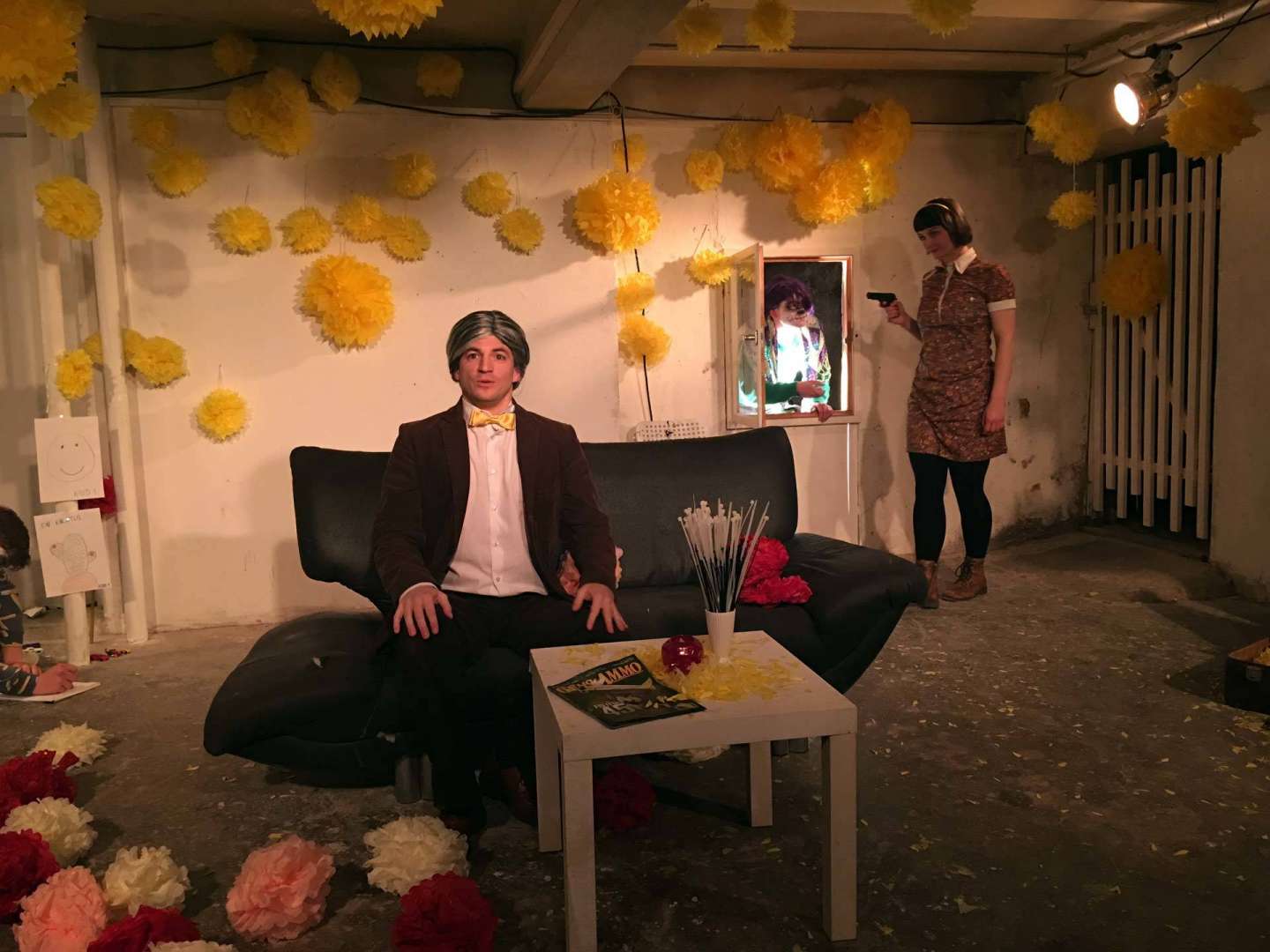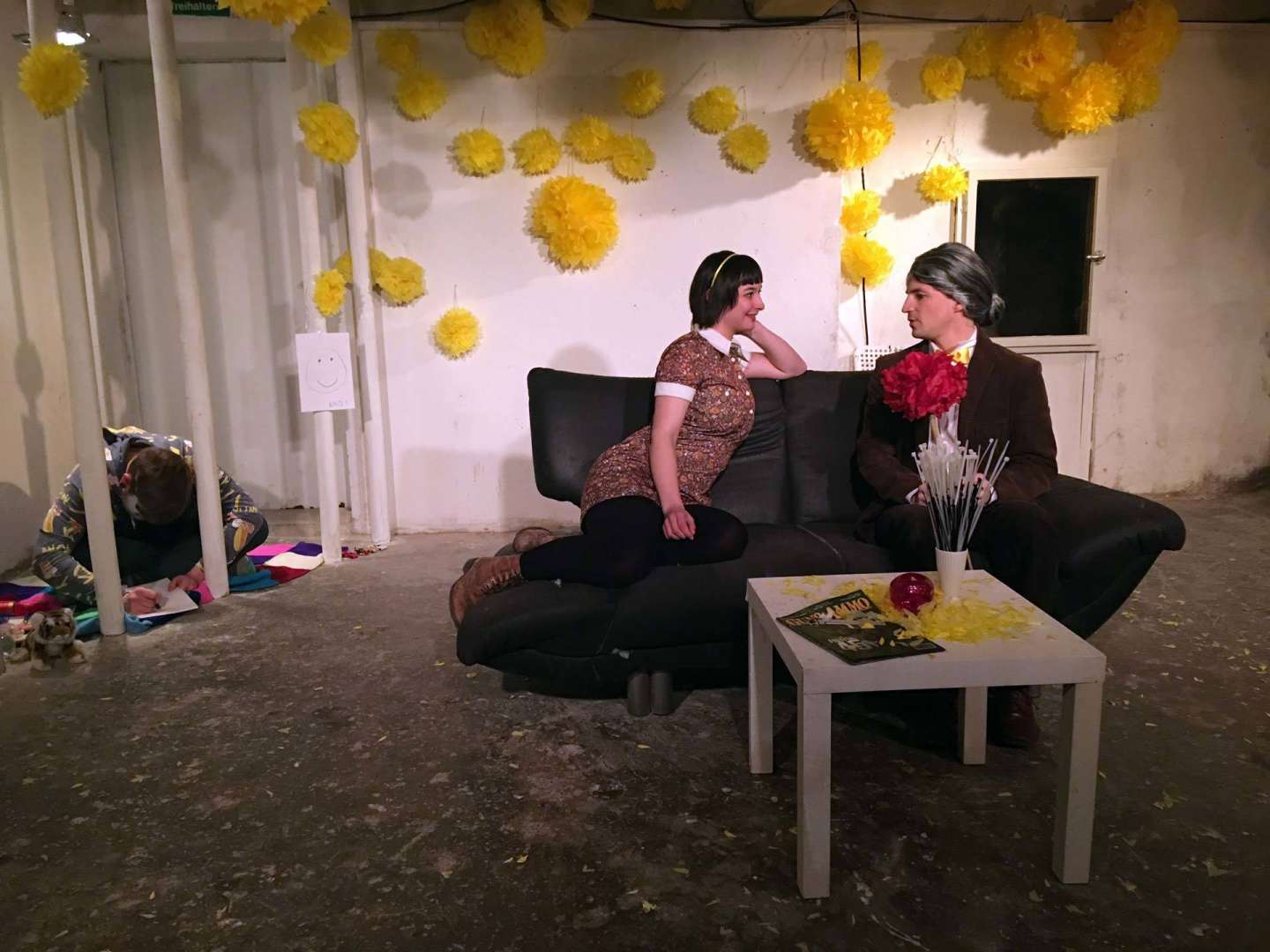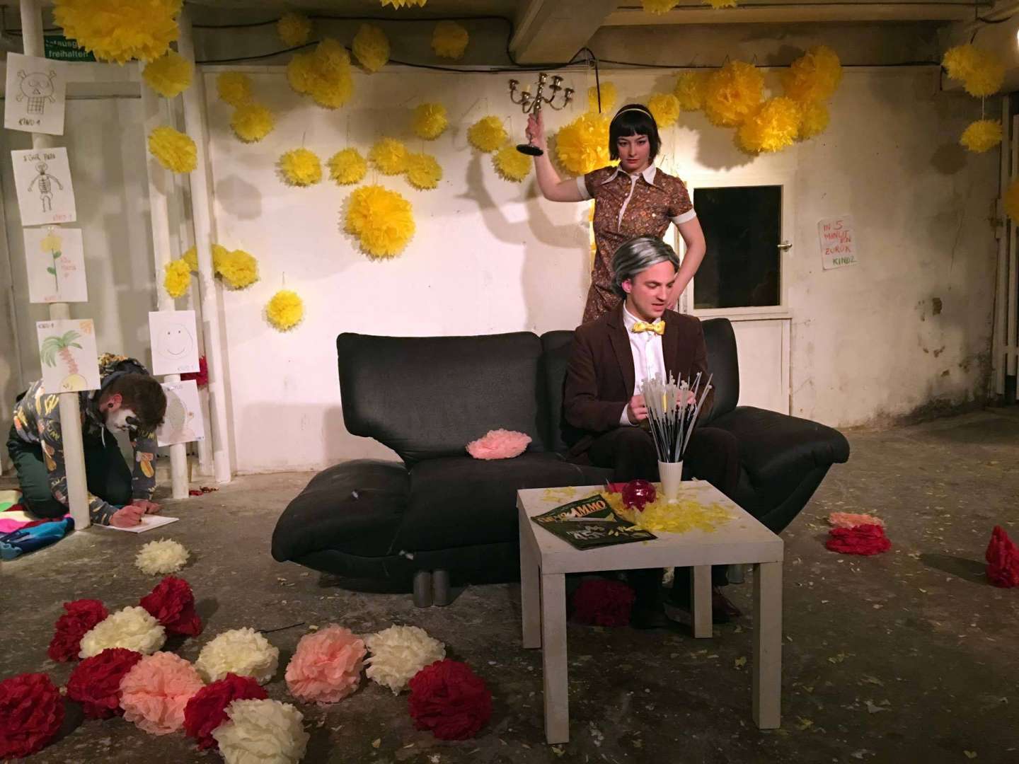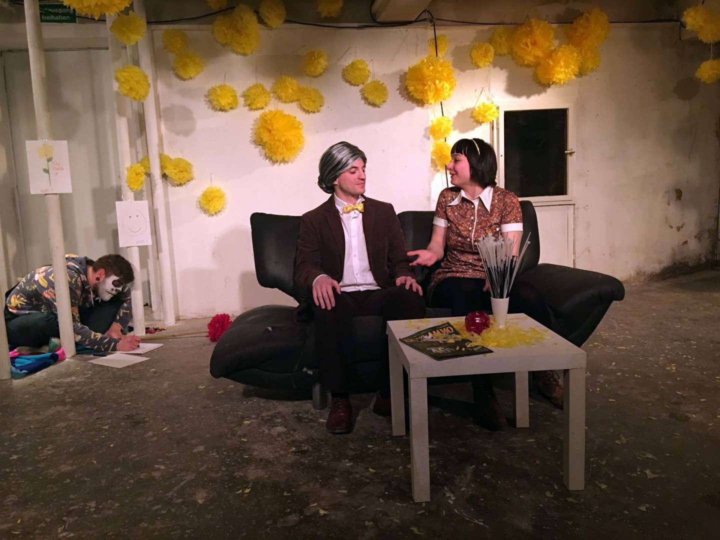 Ihr seit jetzt etwas verwirrt? Macht nichts. Man kann die Welt halt auf unterschiedliche Arten wahrnehmen. Für die Zeit des Stückes habe ich mich für Annas Variante entschieden. Ich habe mich einfach hingegeben und treiben lassen. Auf dem Flyer zum Stück steht noch „Ein surrealer Reigen über Leichen im Keller, Zeitparadoxe sowie Tagträume auf dem Balkon. Gruselig. Komisch. Philosophisch“ Kann ich so unterschreiben und es macht viel Spaß dieser Geschichte zu folgen.