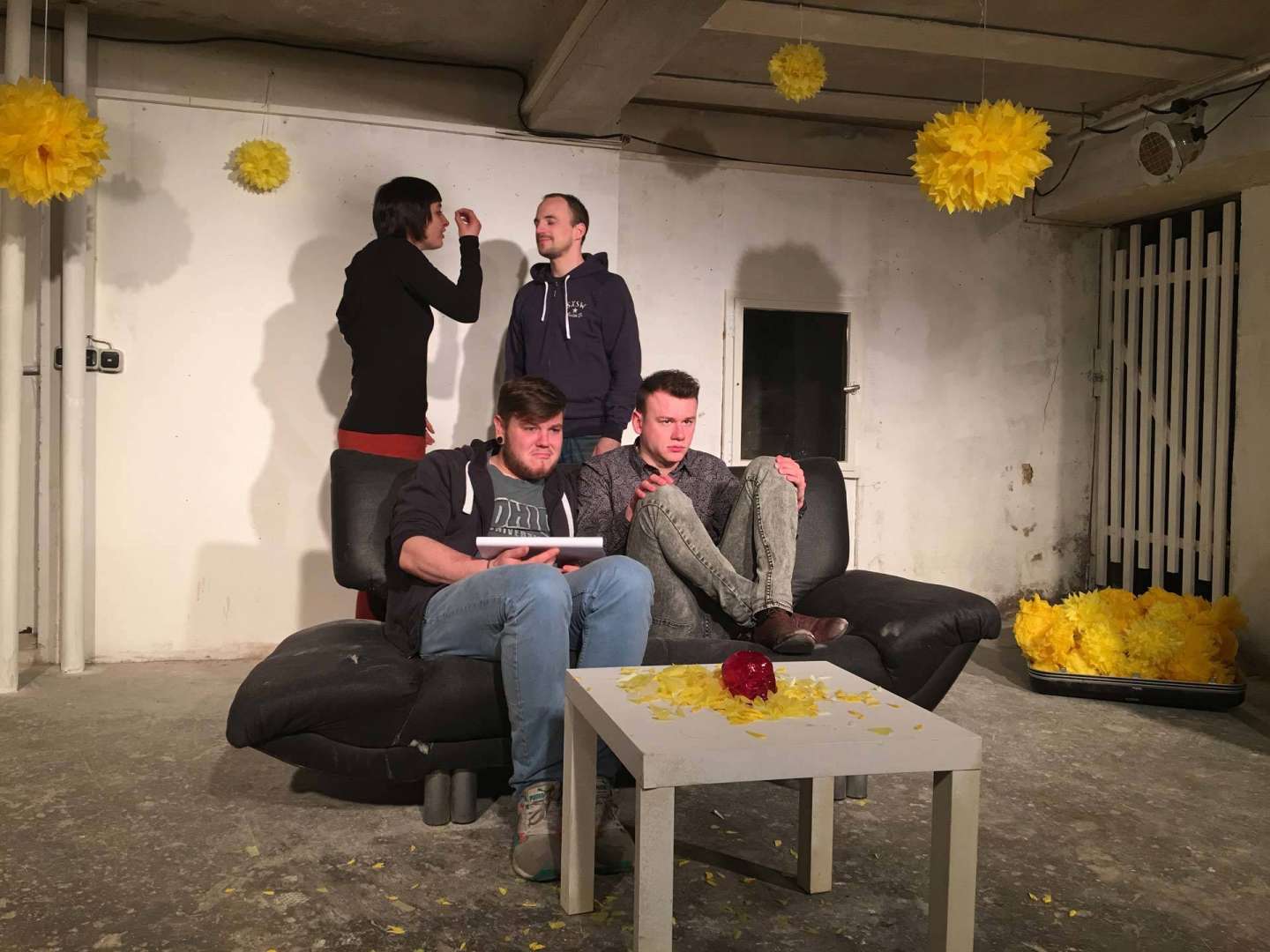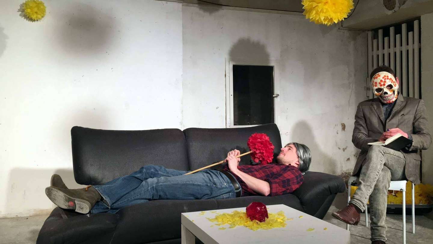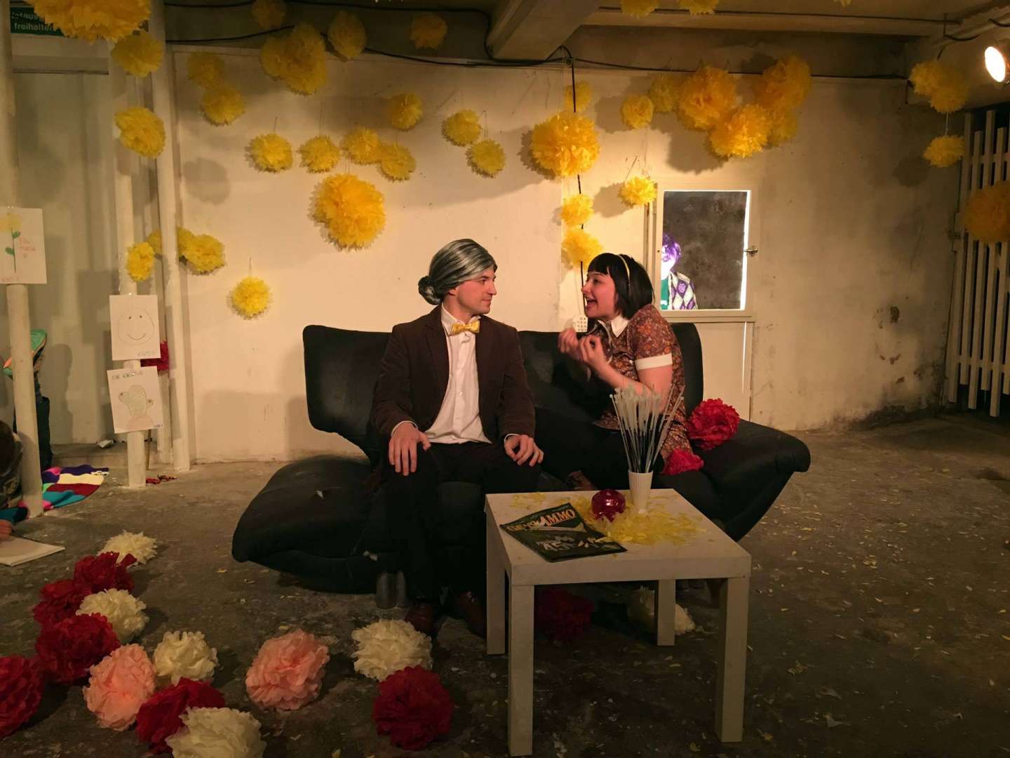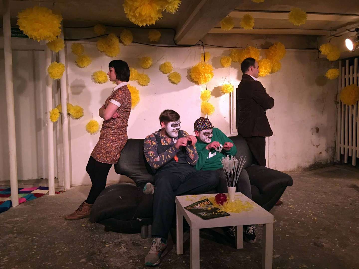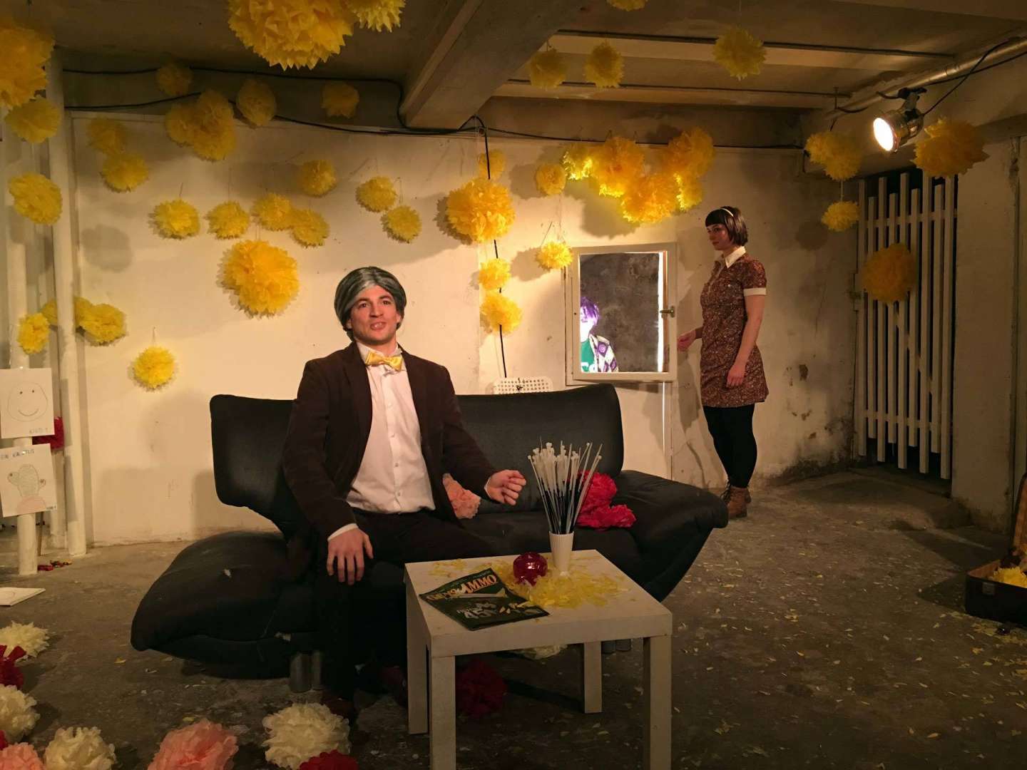Ihr seit jetzt etwas verwirrt? Macht nichts. Man kann die Welt halt auf unterschiedliche Arten wahrnehmen. Für die Zeit des Stückes habe ich mich für Annas Variante entschieden. Ich habe mich einfach hingegeben und treiben lassen. Auf dem Flyer zum Stück steht noch „Ein surrealer Reigen über Leichen im Keller, Zeitparadoxe sowie Tagträume auf dem Balkon. Gruselig. Komisch. Philosophisch“ Kann ich so unterschreiben und es macht viel Spaß dieser Geschichte zu folgen.